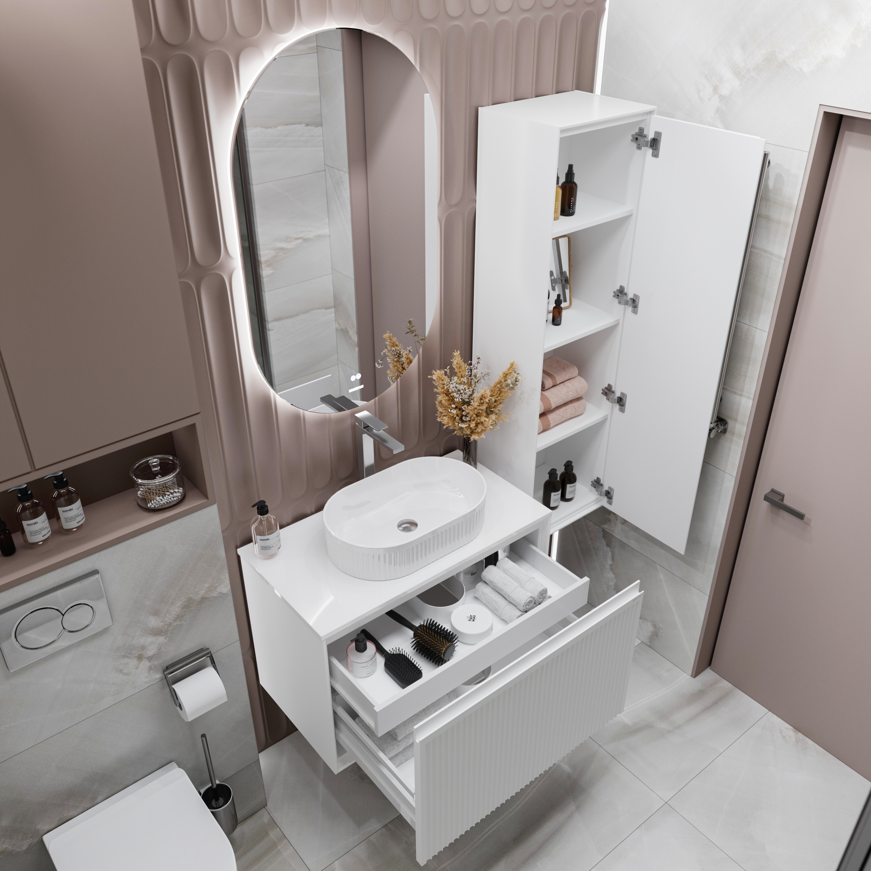 Подвесной пенал “КРИСТАЛЛ” 35 см, универсальный, белый глянец — компактный и стильный элемент мебели для ванной комнаты. Корпус и фасады выполнены из МДФ, окрашенного в белый цвет с глянцевым финишем. Фасад с вертикальным рифлением придаёт изысканный внешний вид, а безручечный дизайн и петли с доводчиком обеспечивают плавное и бесшумное закрытие.